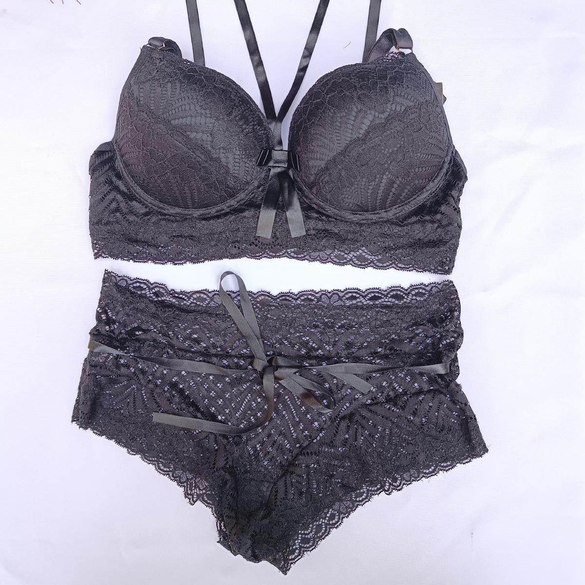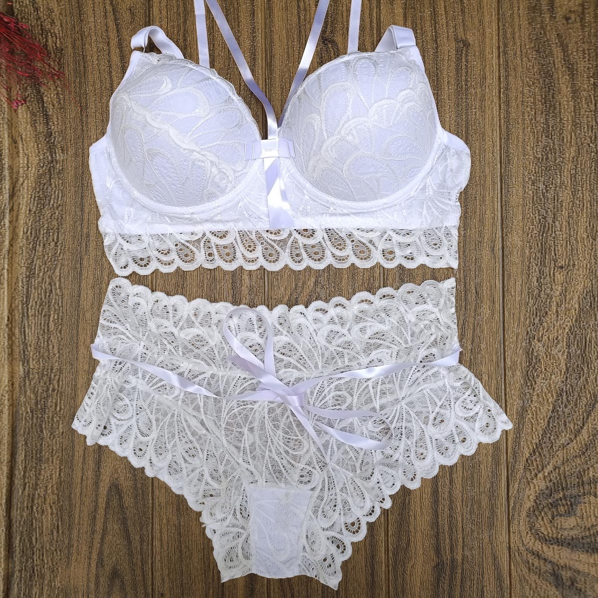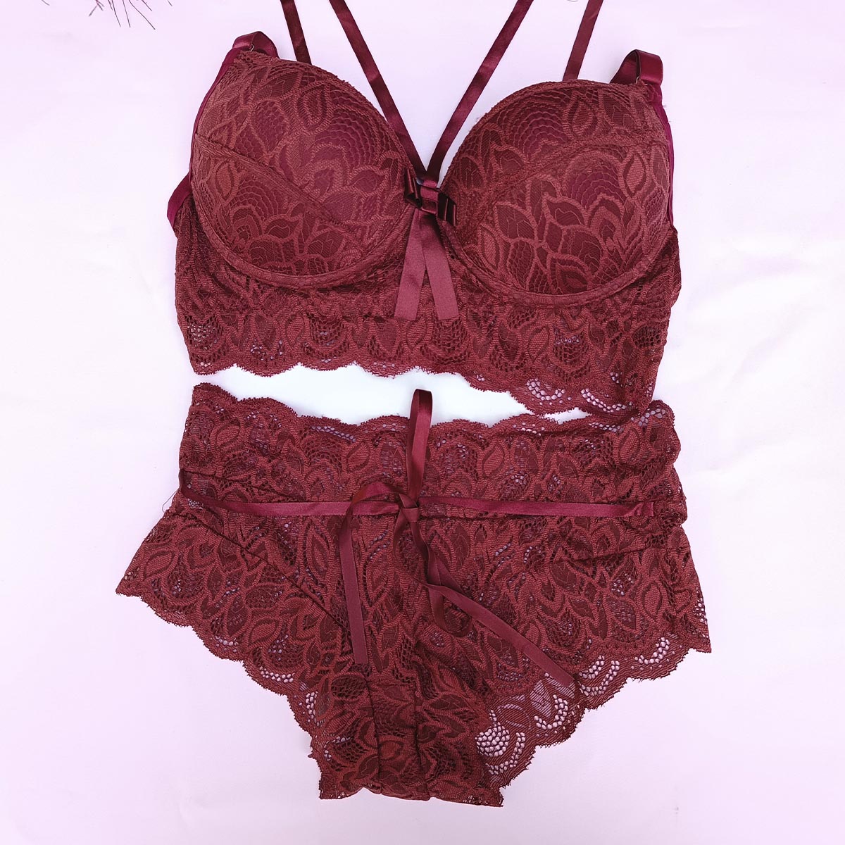 – Confeccionado em renda e detalhes em cetim